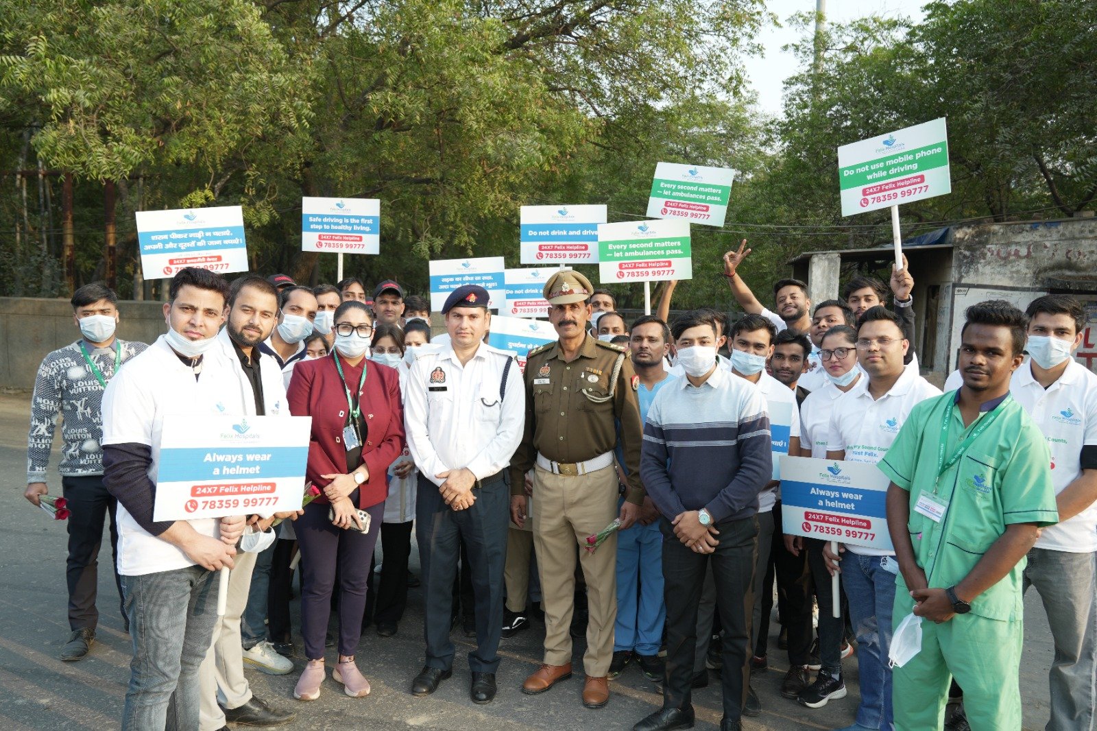 इस अभियान में शकील अहमद ( ACP ट्रैफिक पुलिस ), बलराम सिंह (ट्रैफिक इंस्पेक्टर), राजवीर खरी (ट्रैफिक सब इंस्पेक्टर ), कपिल धामा (रोड सेफ्टी सेल ) और ट्रैफिक पुलिस कर्मचारियों के साथ इस जागरूकता कार्यक्रम में अस्पताल के विभिन्न विभागों के कर्मचारियों ने वॉलंटियर के रूप में हिस्सा लिया और राहगीरों व वाहन चालकों को सुरक्षित ड्राइविंग के प्रति जागरूक किया।यातायात नियम का पालन करने वाले चालकों को गुलाब का फूल देकर प्रोत्साहित किया गया। इस दौरान अस्पताल की कर्मचारी को नीलक्शी को याद किया गया।फेलिक्स अस्पताल के चेयरमैन डॉ. डी.के. गुप्ता ने बताया कि अभियान की थीम अभी कॉल करें, एक जीवन बचाएं और हर जिंदगी सुरक्षित घर पहुंचे पर आधारित रही।