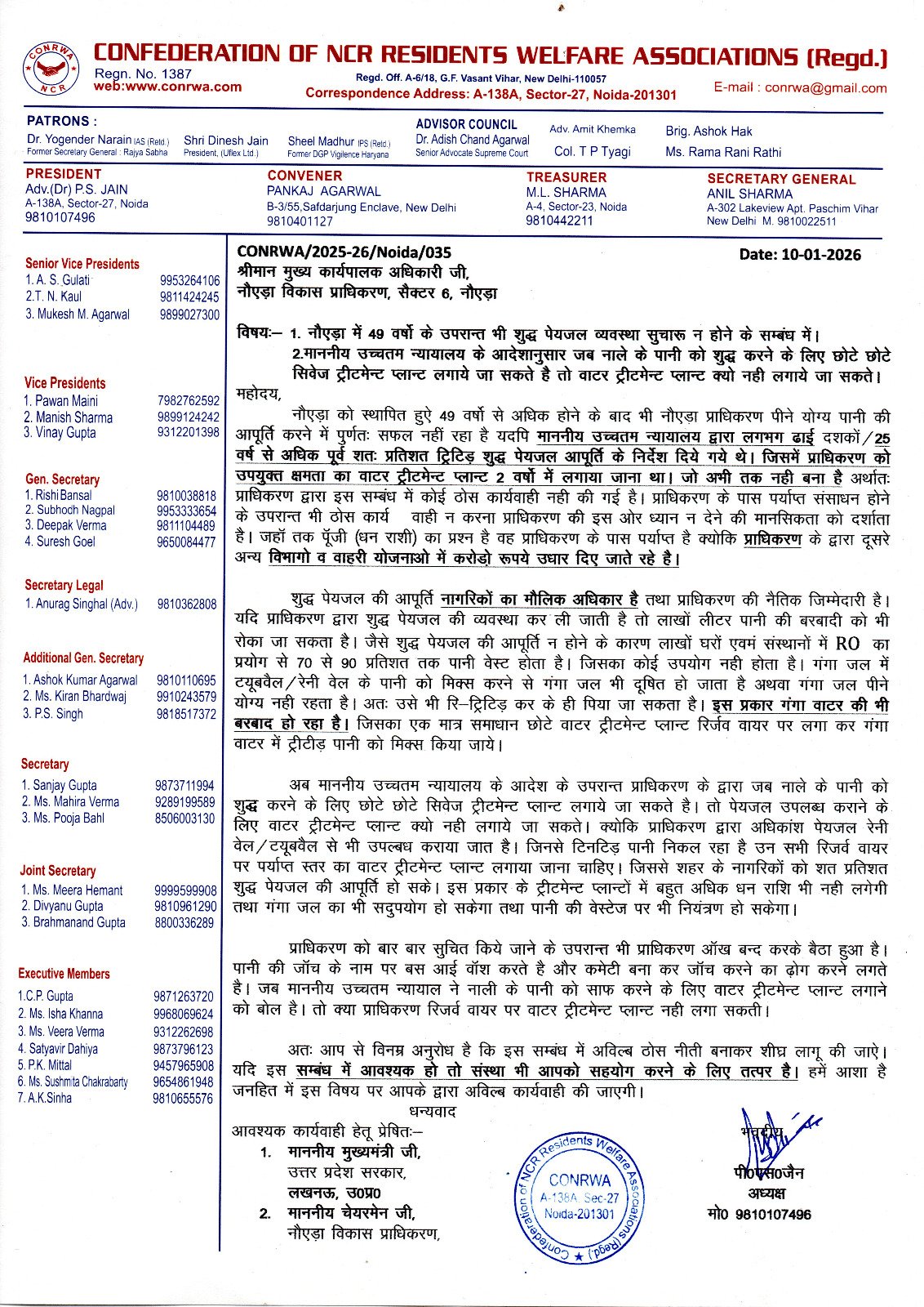 आरोप है कि लोगों को शुद्ध पेयजल की आपूर्ति न होने के कारण लाखों लोग दूषित पानी पीने को मजबूर है। प्राधिकरण बार-बार नोटिस और सुचना दिए जाने के बावजूद आंखें मूंदे बैठा है और जांच के नाम पर सिर्फ आयोग बनाकर समय बिता रहा है।पत्र में पी.एस. जैन ने प्राधिकरण की कार्यशैली पर सवाल खड़े करते हुए कहा कि प्राधिकरण के पास पर्याप्त संसाधन हैं।वह अन्य विभागों और योजनाओं में करोड़ों रुपये उधार दे सकता है, लेकिन नागरिकों के मौलिक अधिकार और अपनी नैतिक जिम्मेदारी को पूरा करने के लिए पैसा खर्च करने में आनाकानी करता है।